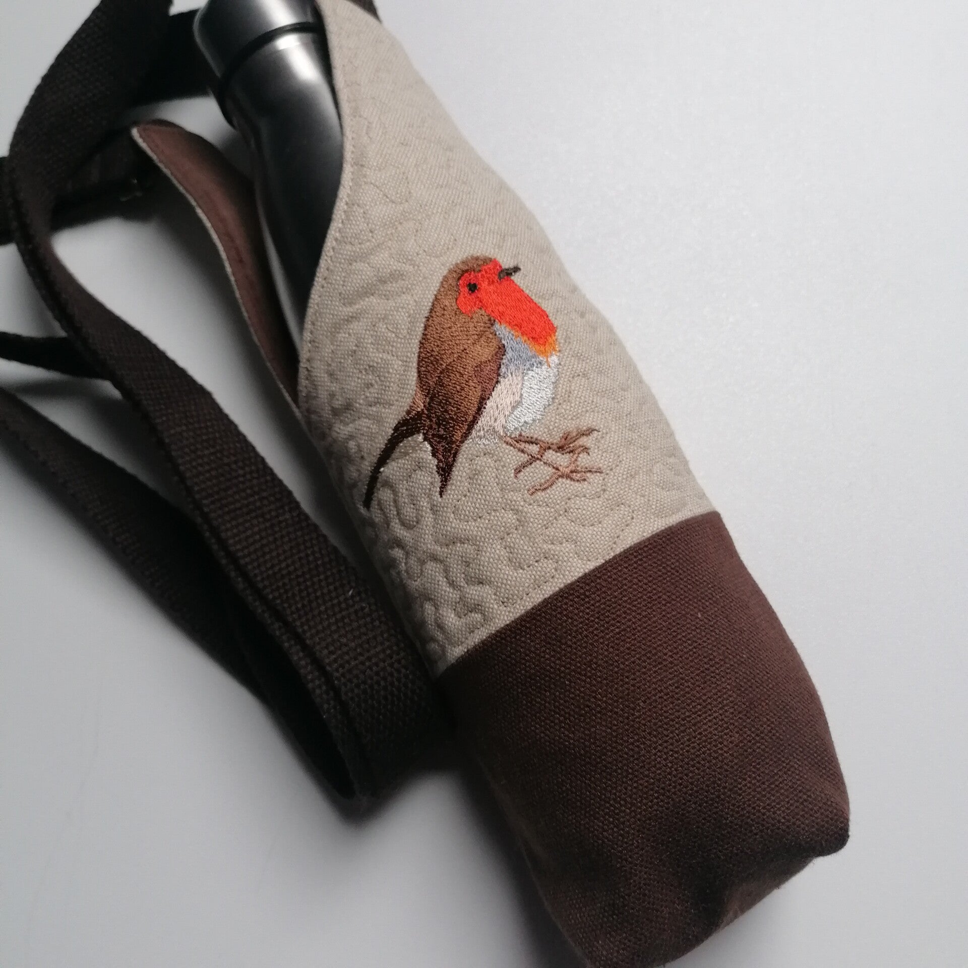 Embroidered water bottle carriers to carry your water bottle/ Small flask/ hands free in style. The top is in 100% linen fabric with embroidered garden bird or animal, the bottom is cotton canvas contrast fabric and has a coordinating adjustable webbing strap to wear across the body. all are lined in a coordinating polycotton fabric will fit steel insulated bottles as in photo (not supplied) will hold most drinks bottles 7 cm in diameter.