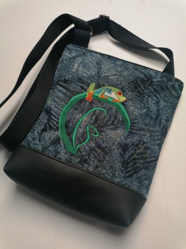 This beautiful bag has a digitally embroidered Red Footed Tree Frog, clinging onto a plant stem among blue batik ferns, freemotion quilted. The bag has a zipped opening, navy canvas back, black textured faux leather base and adjustable black webbing strap measuring 142cm (56")max , bag measures 24cm (91/2") high, 22cm (8 1/2") wide. A lovely little bag for any nature lover, big enough for those essentials: phone, glasses, purse, keys etc. Royal Mail Tracked 48 postage included.