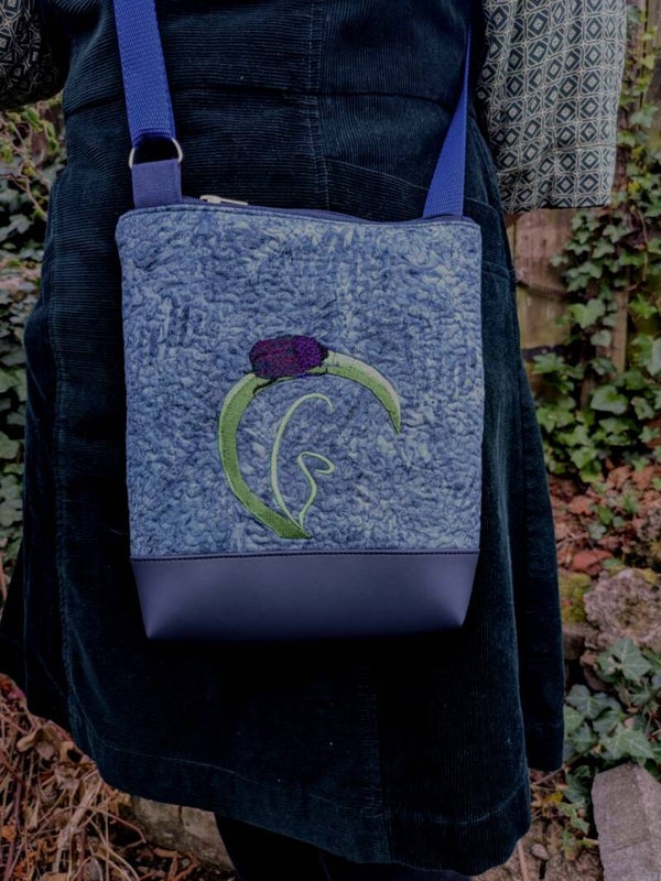 A beautiful bag with a digitally embroidered Purple Scarab Beetle, clinging onto a plant stem among blue batik ferns, freemotion quilted. Here I used a metallic thread in shades of purple and green to give the 'iridescent' effect of the beetle's shell. The bag has a zipped opening, blue canvas back, navy faux leather base and adjustable blue webbing strap measuring 142cm (56")max , bag measures 24cm (91/2") high, 22cm (8 1/2") wide. A lovely little bag for any nature lover, big enough for those essentials ; phone, glasses, purse, keys etc. Royal Mail Tracked 48 postage included.