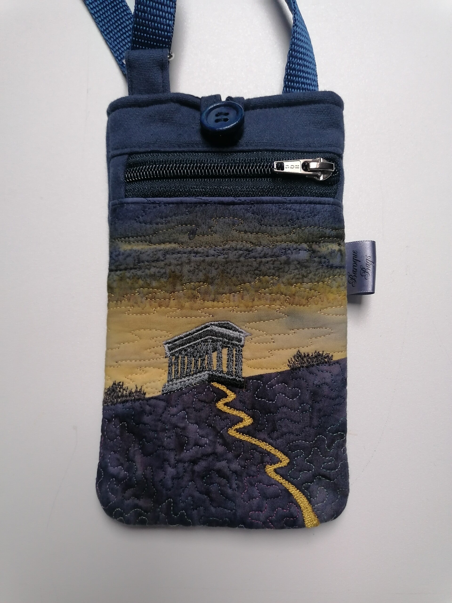 Crossbody phonecase for when you need to carry your phone, glasses, cards etc. hands free. Using batik 100% cotton fabric the front has an embroidered local North East landmarks, Penshaw Monument or Lindisfarne Castle, against a freemotion quilted batik sky and landscape. The bag is padded with an adjustable strap with silver slider and D ring, zipped front pocket and open top, fastening with a loop and wooden button, cotton canvas back, and adjustable webbing strap. A great gift for every day use.
